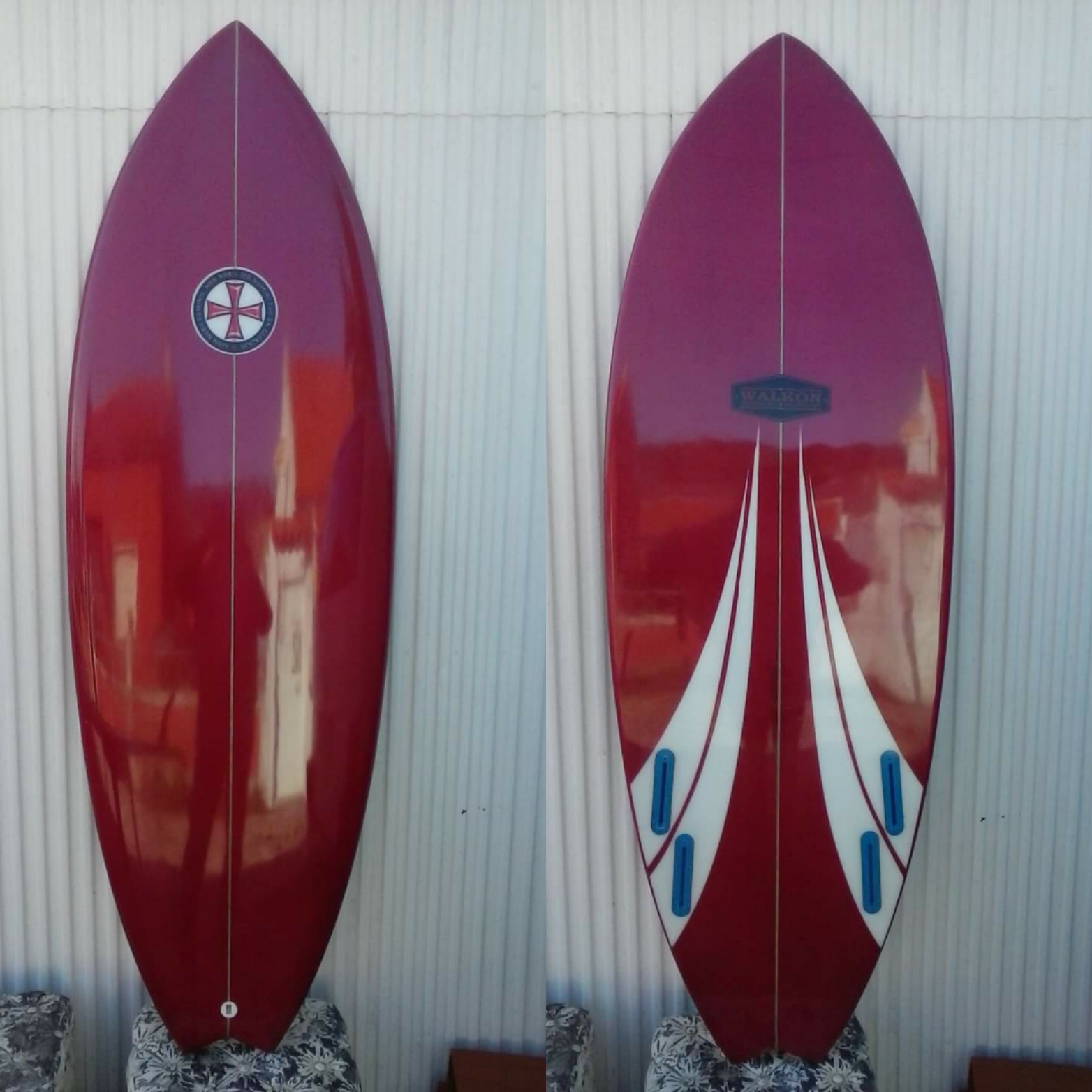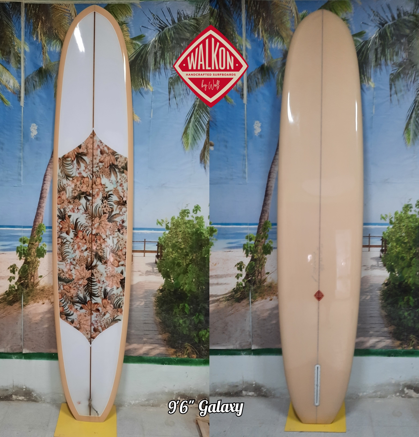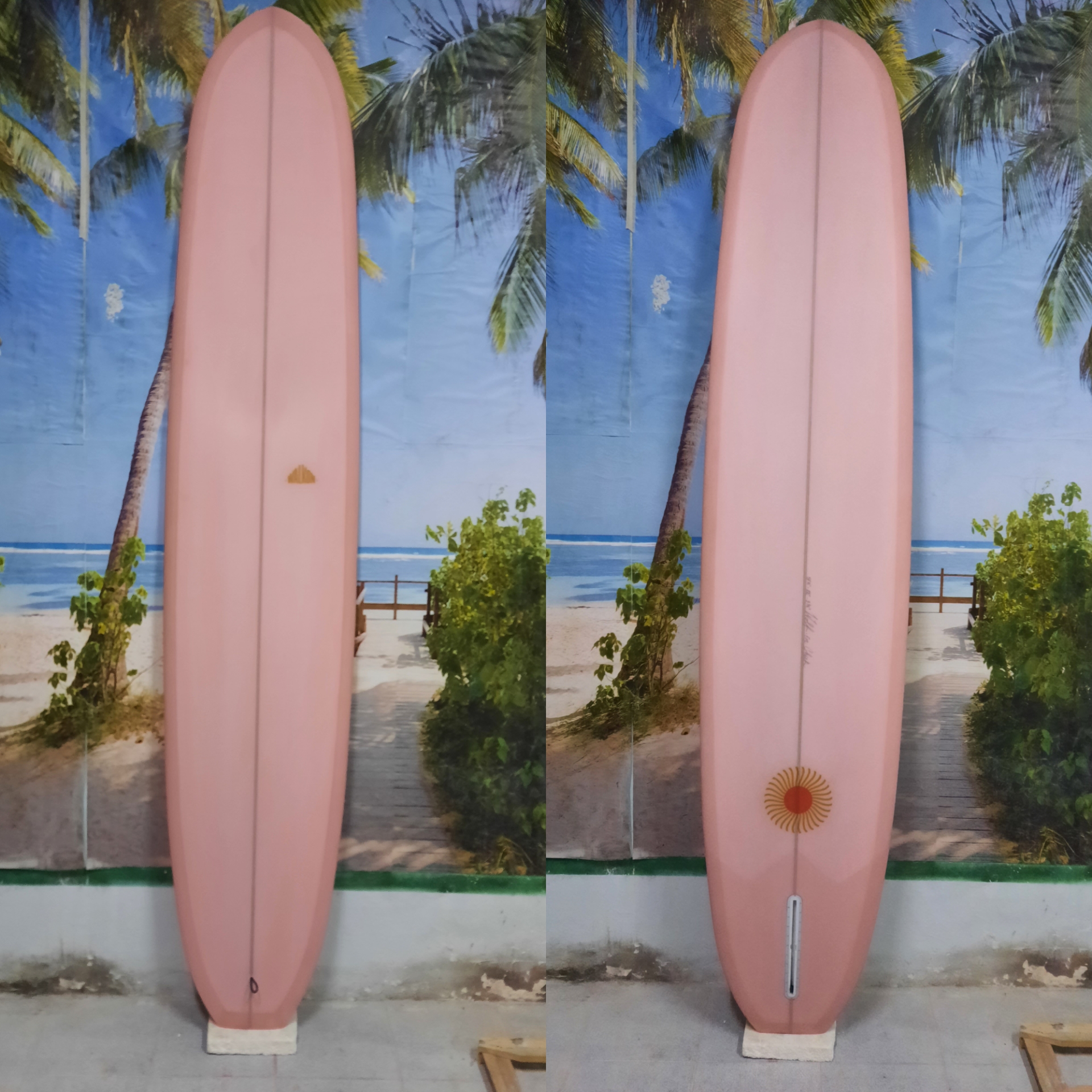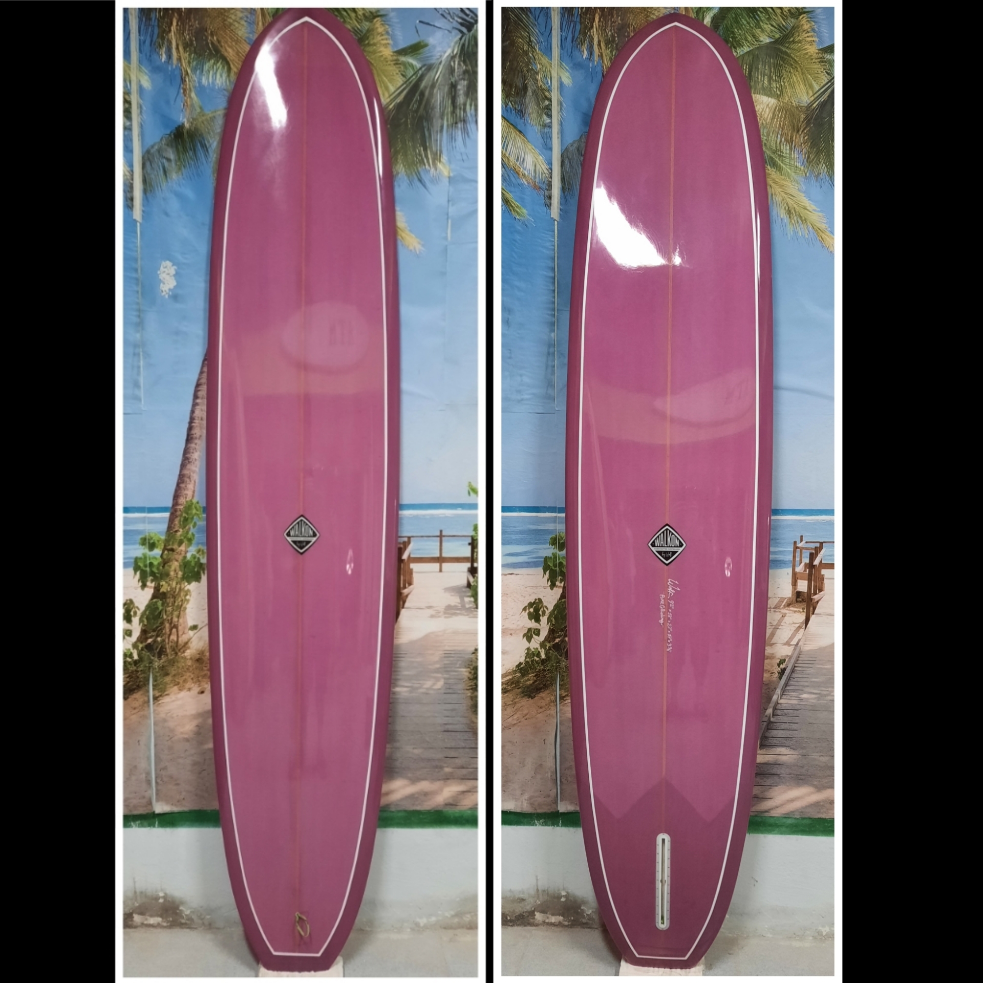 This is our classic model. Very functional for the surfer who loves longboarding and need to get a better performance. Easy paddling, stable when take-off, fast and easy turns. This model goes from 9`0" to 9`8" Length, 22" to 23" Width, 2 7/8" to 3 1/2" Thickness. Bottom: Concave nose to flat to extended vee to smoth kicked up tail. Tail style can be rounded pin, rounded squash, rounded square and square. 50/50 pinched middle rails for nose riding, and 60/40 up turned railed V tail. Recommended fins: from 9. 75" to 10".
